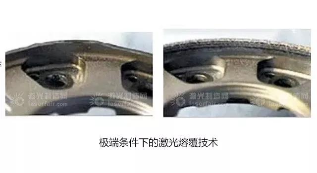 隨著激光熔覆技術(shù)的成熟與發(fā)展,陸續(xù)成功的應(yīng)用于瓦楞輥的激光熔覆見圖4,缸套火焰環(huán)的激光熔覆直接制造見圖5,發(fā)動(dòng)機(jī)部件修復(fù)見圖6等。實(shí)現(xiàn)了以激光為主要加工手段對各種金屬部件的幾何缺失,按照原制造標(biāo)準(zhǔn)進(jìn)行幾何尺寸的回復(fù)、性能的提升。隨著科學(xué)技術(shù)和工程技術(shù)的發(fā)展與需要,金屬部件工作的條件愈來愈苛刻,經(jīng)常工作在高交變應(yīng)力、高溫、高速、高腐蝕等極端條件下。因此,制造金屬部件的材料需要同時(shí)具有多種性能才能滿足零件特殊的服役條件。而且這些部件的制造成本、制造周期長,一旦失效產(chǎn)生巨大的經(jīng)濟(jì)損失和安全事故。如輪機(jī)裝備中,各類重要的部件如:葉片、轉(zhuǎn)子軸頸、閥桿、葉輪、閥門等;飛機(jī)發(fā)動(dòng)機(jī)、內(nèi)燃機(jī)部件等。這些工程上的技術(shù)難題,為激光熔覆技術(shù)提出了新的挑戰(zhàn)。因此,如何解決極端條件下失效零部件的修復(fù)問題是十分迫切和復(fù)雜的,需要對極端條件下,零部件的失效形式分析,剩余壽命進(jìn)行評(píng)估,選擇合適的材料、工藝方法。因此,以極端條件下關(guān)鍵零部件的強(qiáng)化與修復(fù)為切入點(diǎn),系統(tǒng)研究激光熔覆強(qiáng)化與再制造技術(shù),通過若干關(guān)鍵技術(shù)的聯(lián)合攻關(guān),獲得適合于極端條件下,各種零部件強(qiáng)化與修復(fù)的總體技術(shù)。