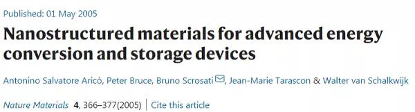 該文在2005年由羅馬薩皮恩扎大學Bruno Scrosati教授等人發(fā)表于Nature Materials。截至2021年2月17日,該文累計被引6,958次。