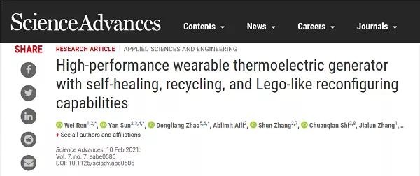 Ren et al. High-performance wearable thermoelectric generator with self-healing, recycling, and Lego-like reconfiguring capabilities. Science Advances. 7, eabe0586 (2021). doi.org/10.1126/sciadv.abe0586.