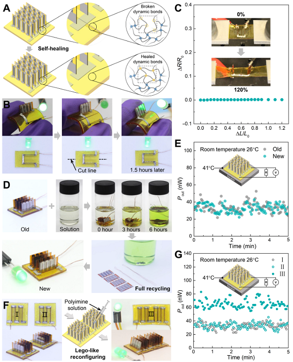 圖4 (A,B,C)自愈合、(D,E)可循環(huán)和(F,G)類(lèi)樂(lè)高可重構(gòu)的熱電器件