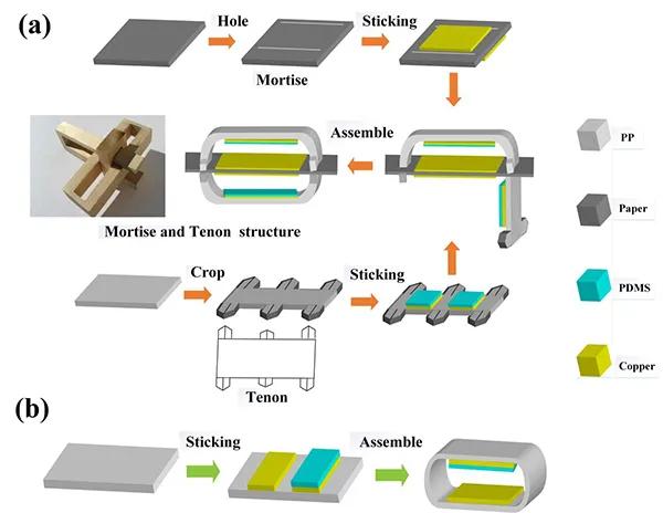 通過對中國傳統(tǒng)榫卯工藝的深入研究,利用廢棄紙張和聚丙烯(PP)材料,構(gòu)建了一種新型的榫卯結(jié)構(gòu)摩擦納米發(fā)電機(jī)(MT-TENG),這種新結(jié)構(gòu)可以實現(xiàn)高度的堅固性和空間分割。