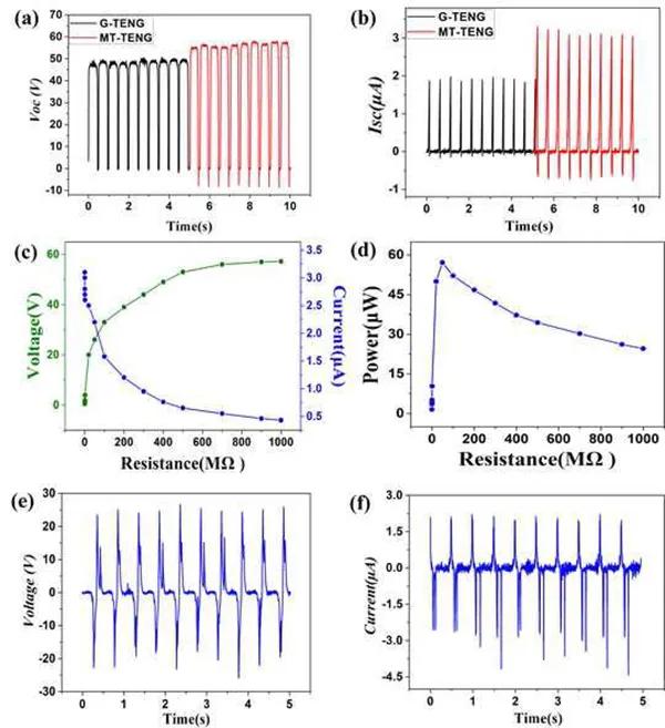 (a,b)在相同條件下,測量了G-TENG和MT-TENG的開路電壓、短路電流;(c)輸出電壓與電流與MT-TENG負(fù)載電阻的關(guān)系;(d)輸出功率密度與MT-TENG負(fù)載電阻的關(guān)系;(e,f)50MΩ MT-TENG的輸出電壓和電流。