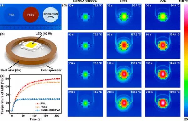 (a) PVA、FCCL和本樣品的實物照片。(b)實際散熱測試的實驗系統(tǒng)設(shè)置。(c)使用不同薄膜作為勻熱膜時LED芯片的中心溫度隨運行時間的變化,及其(d)相應(yīng)的IR圖像。