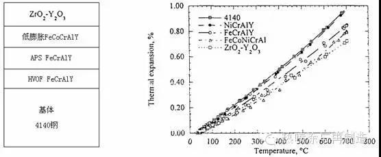 有的多層結(jié)構(gòu)通過采用多種成分涂層來滿足一種性能要求,例如,為了開發(fā)出能夠滿足柴油發(fā)動(dòng)機(jī)用的長(zhǎng)壽命厚熱障涂層,Robert等采用了熱膨脹系數(shù)非常接近的三層結(jié)合底層來降低涂層熱應(yīng)力,其涂層結(jié)構(gòu)如圖所示,各層涂層的熱膨脹行為如右圖所示。由于基體材料4140、NiCrAlY、FeCrAlY、FeCoNiCrAl和ZrO2-Y2O3之間膨脹系數(shù)屬于逐漸變化的,從而可以大幅度減小ZrO2-Y2O3涂層與基體之間的熱膨脹不匹配性,從而達(dá)到減小熱應(yīng)力、延長(zhǎng)使用壽命的目的。