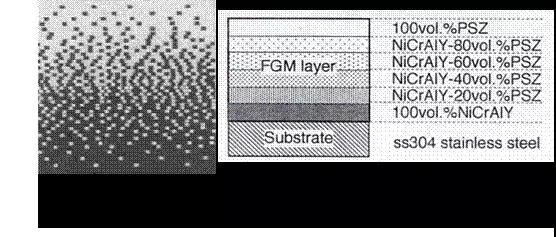 在熱障涂層中,由于粘結(jié)層金屬和氧化鋯陶瓷的熱膨脹系數(shù)差異較大,這種差異將導(dǎo)致涂層內(nèi)應(yīng)力過大,并且在熱循環(huán)條件下常發(fā)生陶瓷涂層的早期破壞。為了減小內(nèi)應(yīng)力,提高涂層與基體的結(jié)合強(qiáng)度,材料科學(xué)家開始在常規(guī)熱障涂層中引入功能梯度材料制備技術(shù)。