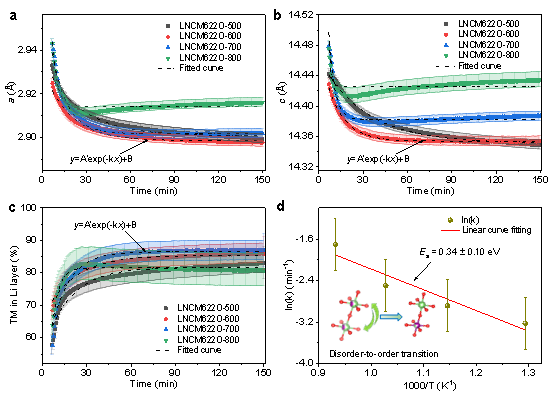 圖4 高溫鋰化反應(yīng)動(dòng)力學(xué)研究:無(wú)序?qū)訝頛i1-x(Ni0.6Co0.2Mn0.2)1+xO2結(jié)構(gòu)中a 晶胞參數(shù)a,b 晶胞參數(shù)c,c Li/TM混排在不同溫度下隨時(shí)間的變化;d Li/TM離子由無(wú)序到有序轉(zhuǎn)化活化能計(jì)算圖。