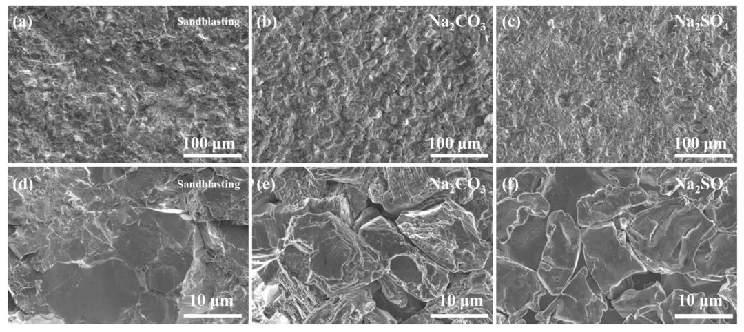 圖 1 SiC 陶瓷表面微觀形貌:(a), (d) 未處理的 SiC 陶瓷;(b), (e) Na2CO3 熔鹽 900℃處理 4 h;(c), (f) Na2SO4 熔鹽 900℃處理 4 h