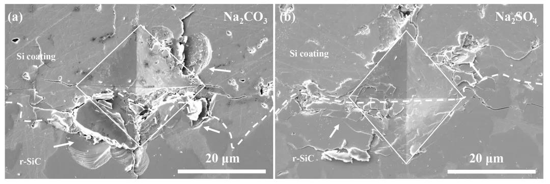 圖 5 SiC 陶瓷的涂層 - 基體界面壓痕形貌:(a) Na2CO3 熔鹽 900℃處理 4 h;(b) Na2SO4 熔鹽 900℃處理 4 h