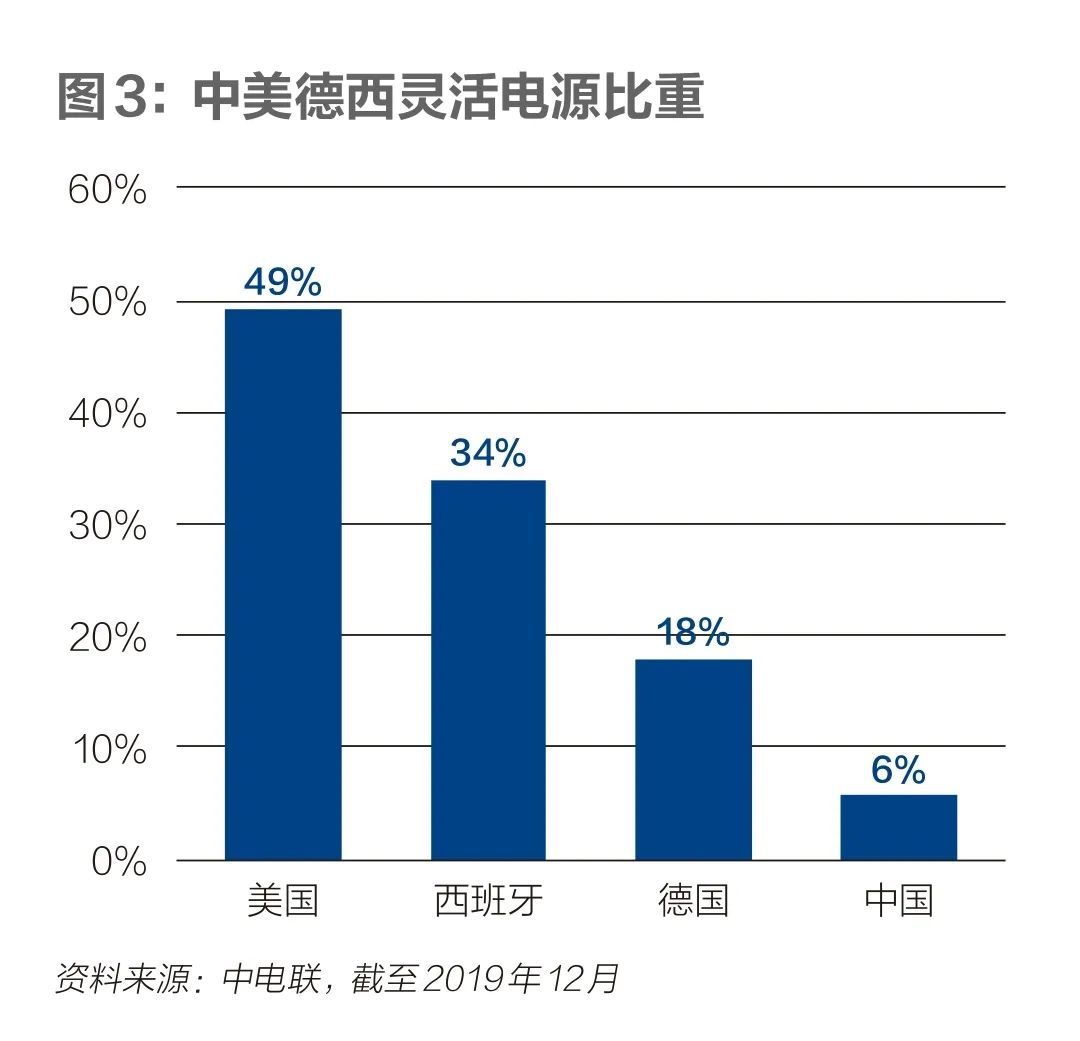 中電聯(lián)2019年12月發(fā)布的《煤電機(jī)組靈活性運(yùn)行政策研究》顯示,歐美國(guó)家的靈活電源比重普遍較高,西班牙、德國(guó)、美國(guó)占比分別為34%、18%、49%,而中國(guó)占比不到6%。在中國(guó)新能源資源富集的三北地區(qū),風(fēng)電、太陽(yáng)能發(fā)電裝機(jī)分別占全國(guó)的72%、61%,但靈活調(diào)節(jié)電源還不足3%。