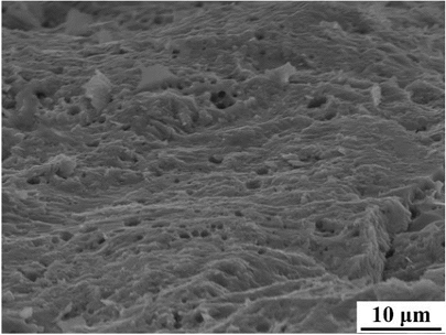 另一方面,依據(jù)圖 14 所 示結(jié)果,當(dāng)材料的熔點(diǎn)低于約 1500℃時(shí),其臨 界溫度將降至室溫以下,這意味著可以在室溫噴 涂沉積粒子間充分結(jié)合的陶瓷涂層。采用熔點(diǎn)約 為 1370℃的鈦酸鉀制備的陶瓷涂層的斷裂面形 貌如圖 15 所示 [40],因粒子間結(jié)合充分而呈現(xiàn)與 傳統(tǒng)陶瓷涂層的層狀結(jié)構(gòu)完全不同的特征,反而 與燒結(jié)致密陶瓷塊材相同,該結(jié)果對(duì)推動(dòng)陶瓷涂 層應(yīng)用的發(fā)展、拓展陶瓷涂層新的應(yīng)用領(lǐng)域具有 重要意義。