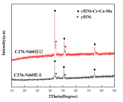 C276-Ni60 粉末和涂層的 XRD 圖譜如圖 2 所示, 結(jié)合表 1 和表 2 噴涂粉末的成分可以表明,C276-Ni60 粉末和涂層的主要物相為 γ 相的 Ni-Cr-Co-Mo, 這表明等離子焰流的溫度并沒(méi)有明顯改變 C276-Ni60 粉末的相組成。涂層和粉末實(shí)際都是以鎳基為主的 γ 相,這可能是由于噴涂的合金粉末中 Ni60 占比較低,未檢測(cè)到明顯的不同相。同時(shí)噴涂的粉末中擁有含量較高的 Cr 和 Mo 元素,因此主要物相為 γ 相的鎳基合金的涂層抗腐蝕性較強(qiáng)。