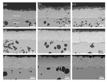 9 種不同 APS 工藝參數(shù)制備的 C276-Ni60 涂層微觀組織結(jié)構(gòu)如圖 3 所示。從圖 3 中可以看出,基體和涂層結(jié)合的結(jié)合面處形成的是不規(guī)則的交錯(cuò)咬合,其結(jié)合方式為機(jī)械結(jié)合。此外,涂層中還存在著少量不同大小、形狀的孔洞及未熔粉末顆粒。