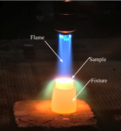 采用掃描電子顯微鏡(Quanta FEG 650 型,荷蘭 FEI 公司) 對 Cr2O3-TiO2 復(fù)合粉末( 噴霧造粒、 燒結(jié)處理) 及涂層的微觀結(jié)構(gòu)進(jìn)行表征。采用 X 射線衍射儀( D/max-RC 型, 日本, 掃描范圍為 20~80°) 對粉末和涂層進(jìn)行物相分析。根據(jù) GB/T 8642-2002《熱噴涂 抗拉結(jié)合強(qiáng)度的測定》 測試涂層結(jié)合強(qiáng)度。根據(jù) GJB323A-1996《燒蝕材料燒蝕試驗方法》 , 采用氧乙炔火焰對復(fù)合涂層進(jìn)行燒蝕性能測試, 燒蝕參數(shù)如表 3 所示。氧乙炔燒蝕示意圖如圖 2 所示。分別采用美國 FLUKE 公司E1RH-F2-L-0-0 型紅外測溫儀和德國 HBM 公司 QUANTUM X 1609 型數(shù)據(jù)采集系統(tǒng)對試樣燒蝕過程中表面溫度和背部溫度進(jìn)行監(jiān)控。根據(jù) GB/T 7287-2008《紅外輻射加熱器試驗方法》 ,采用紅外輻射測試儀(IRE-2 型, 武漢產(chǎn)品質(zhì)量監(jiān)督檢驗所) 對涂層的法向發(fā)射率( 波長2~15 μm)進(jìn)行測試。測試溫度為400 ℃和 750 ℃。