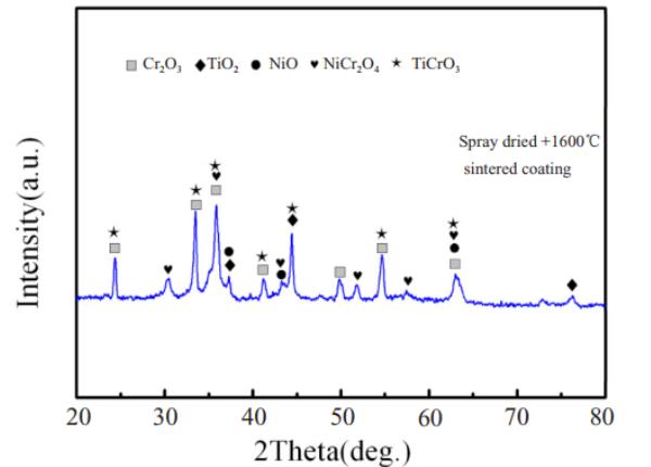 圖 4 為 Cr2O3-TiO2 復(fù)合粉末燒結(jié)前后 XRD 圖譜分析。從圖中可以看出, 復(fù)合粉末燒結(jié)前, 原始粉末獨立存在, 未發(fā)生化學(xué)反應(yīng)。1600 ℃燒結(jié)3 h 后, Cr2O3、 TiO2 和 NiO 衍射峰有所降低, 同時出現(xiàn) NiCr2O4 尖晶石相和 TiCrO3 鈣鈦礦結(jié)構(gòu)相。這表明, 原始粉末在燒結(jié)過程中發(fā)生化學(xué)反應(yīng)形成新的化合物, 從而使復(fù)合粉末不再簡單地依靠粘結(jié)劑物理結(jié)合, 而形成化學(xué)結(jié)合, 提高了粉末的團(tuán)聚效果。同時, NiCr2O4 尖晶石相的出現(xiàn), 有利于提高涂層的發(fā)射率。