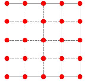 質(zhì)量采用 Sartorius BSA224S 分析天平測量,精度為0.1 mg。為了測量試片噴砂后的變形程度,將百分表( 成量川牌百分表, 量程 0~10 mm, 精度 0.01 mm) 垂直固定在已校準(zhǔn)的金屬平臺上。如圖 1 所示, 將一塊平板平分為 16 個方格, 噴砂后朝上放置在金屬平臺上, 測試 25 個節(jié)點的高度。