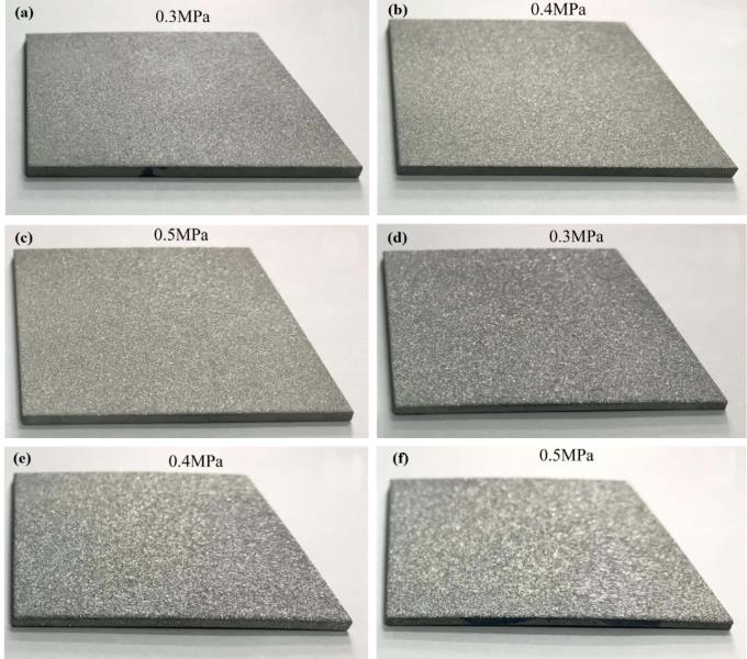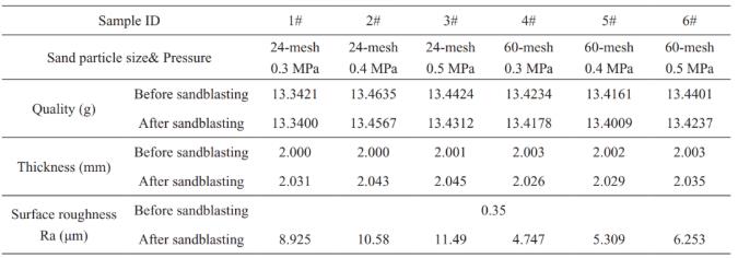 綜上所述,對于鋁合金薄壁件,若表面狀態(tài)良好, 應(yīng)優(yōu)先選擇 60 目砂粒噴砂, 壓力在 0.3~0.5MPa 范圍內(nèi)均可, 降低變形風(fēng)險。涂層修復(fù)等條件下需多次噴砂時, 其粗糙度和結(jié)合強度不會發(fā)生明顯變化, 但會造成基體厚度和質(zhì)量的降低,同時應(yīng)確保表面狀態(tài)的一致性。若表面狀態(tài)較差,可以選擇 24 目砂粒噴砂, 獲得較高的表面粗化效率。
