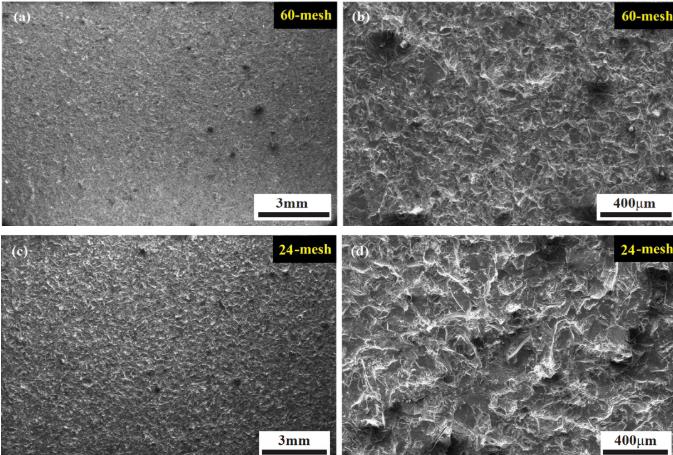 圖 3 鋁基材表面 0.4 MPa 噴砂后 SEM 圖像:(a), (b)60 目;(c), (d)24 目