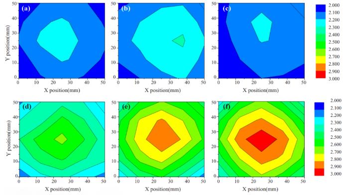 圖 4 鋁基材表面噴砂后高度分布云圖:(a) 60 目, 0.3 MPa 壓力;(b) 60 目, 0.4 MPa 壓力;(c) 60 目, 0.5 MPa 壓力;(d) 24 目, 0.3 MPa 壓力;(e) 24 目, 0.4 MPa 壓力;(f) 24 目, 0.5 MPa 壓力