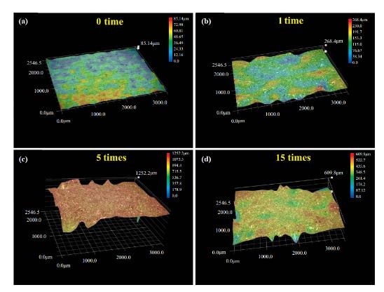 圖 7 鋁基材表面 60 目 0.4 MPa 噴砂前后表面三維光鏡照片:(a) 未噴砂;(b) 噴砂 1 次;(c) 噴砂 5 次;(d) 噴砂 15 次
