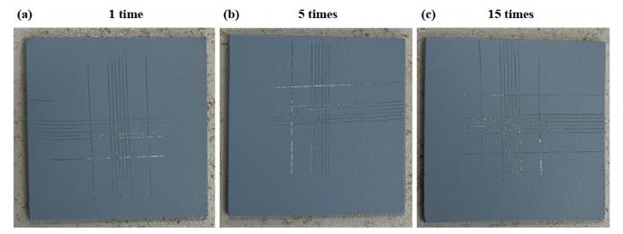 在 6061 鋁合金試片 (50× 50× 2mm3) 上涂覆丙烯酸聚氨酯有機涂層。同樣地,采用 60 目棕剛玉砂噴砂 1 次、5 次和 15 次,隨后涂覆 0.05mm 厚的丙烯酸聚氨酯層,待固化后, 參照 GB/T9286-2021 標(biāo)準(zhǔn)測試涂層附著力。