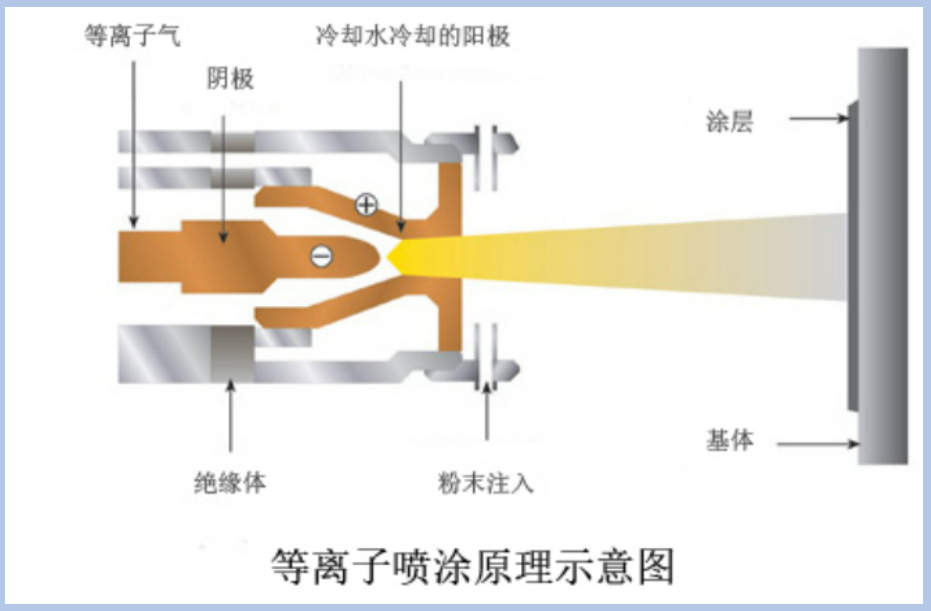 等離子噴涂是采用剛性非轉(zhuǎn)移型等離子弧為熱源,將欲噴涂粉末材料加熱到熔融或半熔融狀態(tài),在經(jīng)過高速焰流將其霧化加速噴射到經(jīng)預(yù)處理的工件表面,形成噴涂涂層的一種熱噴涂表面加工方法。