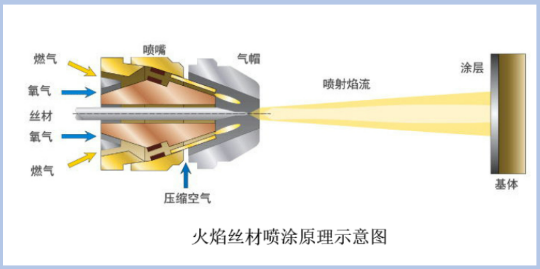 火焰噴涂是以氧氣和燃?xì)猓ㄒ胰?、丙烷、丙烯、天然氣或氫氣等)燃燒所產(chǎn)生的熱量來熔化噴涂材料并通過高壓氣體噴射至工件表面形成涂層的工藝?;鹧鎳娡坎牧系男问揭话阌腥N:粉材、絲材和棒材。粉材火焰噴涂較為普遍,能夠適用于多種零件和工況;絲材噴涂則常用于大規(guī)模的連續(xù)化作業(yè);而棒材則可以噴涂陶瓷材料,生產(chǎn)成本低廉但連續(xù)化作業(yè)難度較大。