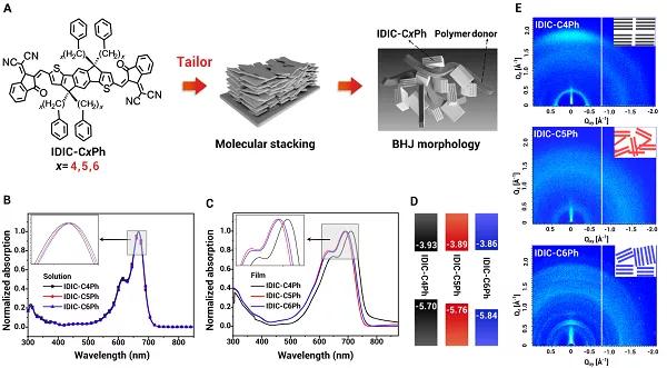 圖1. (A)材料設(shè)計(jì)與思路;(B-C)吸收光譜;(D)分子軌道能級(jí);(E)GIWAXS二維圖