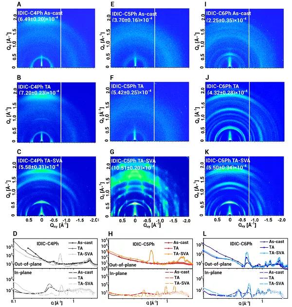 圖3. 材料薄膜處理前后的GIWAXS二維圖(A-C, E-G, I-K)和一維線圖(D、H、L)
