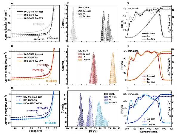 圖4. (A-C) J-V曲線;(D-F) FF值統(tǒng)計(jì)圖;(G-I) EQE曲線