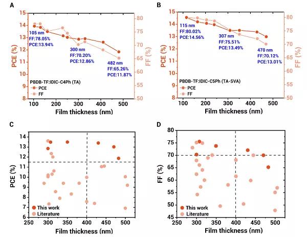 在~100 nm厚的活性層中,光子激子解離后可以高效地傳輸?shù)浇o受體界面并被收集,而在厚膜器件中,電荷傳輸過程中會(huì)發(fā)生嚴(yán)重的復(fù)合損失,從而嚴(yán)重降低OSCs的填充因子FF和最終效率。因此,如何改善厚膜BHJ中電荷傳輸是一個(gè)亟待解決的科學(xué)問題。