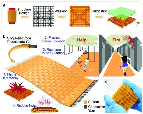 火災(zāi)事故已成為造成嚴(yán)重人身燒傷和毀滅性損失、威脅公共安全和財(cái)產(chǎn)安全的常見(jiàn)災(zāi)害之一。大量的火災(zāi)案例表明,提高人的逃生能力和材料的阻燃能力對(duì)減少人員傷亡具有重要意義。發(fā)生火災(zāi)時(shí),大部分的救援電子設(shè)備由于電力中斷而無(wú)法使用。因此,迫切需要具有阻燃功能的自供電消防電子設(shè)備。在這種情況下,具有機(jī)械能收集和自供電傳感能力的摩擦電納米發(fā)電機(jī)(TENG)可以解決上述問(wèn)題。此外,考慮到室內(nèi)環(huán)境的裝飾及其他功能需求,即具有阻燃功能的紡織品將是制造消防救援傳感器的理想材料。裝飾用紡織品具有降噪、輕量化、透氣性、可洗性、可調(diào)性、柔性等附加功能性能。因此,與薄膜或條狀電子器件相比,裝飾用紡織品將是室內(nèi)能量采集或信號(hào)監(jiān)測(cè)的更好選擇。目前,對(duì)織物TENGs的研究已有眾多的進(jìn)展,但仍存在幾個(gè)阻礙其進(jìn)一步應(yīng)用的關(guān)鍵問(wèn)題有待解決。首先,在整個(gè)織物上浸涂功能材料制造的織物摩擦納米發(fā)電機(jī)(F-TENGs),織物通常硬度高,透水性極差,嚴(yán)重影響其穿著舒適性。其次,多層結(jié)構(gòu)的F-TENGs一般都是通過(guò)復(fù)雜的工藝制備而成,導(dǎo)致器件體積龐大且剛性不足,既不利于采集人體日常小微運(yùn)動(dòng)的能量,也不適合軟性傳感和檢測(cè)的需求。因此,用連續(xù)的TENG紗線通過(guò)織機(jī)制造F-TENG,保證其透氣性、柔韌性和舒適性,是解決上述問(wèn)題的關(guān)鍵。然而,最近報(bào)道的纖維(紗線)形TENG通常存在長(zhǎng)度短、直徑大、細(xì)度不均勻等問(wèn)題,不適合紡織機(jī)械加工技術(shù),直接影響織造效率和織物風(fēng)格。此外,對(duì)于F-TENG這種具有阻燃性能、降噪性能、透氣性等特殊功能的產(chǎn)品,目前還缺乏研究。因此,通過(guò)對(duì)紡紗工藝的控制以獲得細(xì)度均勻、細(xì)度細(xì)的紗線,以及織物結(jié)構(gòu)的設(shè)計(jì)及織造等均對(duì)功能性F-TENG的生產(chǎn)具有十分重要的意義。近日,在新疆大學(xué)青年教師馬麗蕓,中科院北京納米能源與系統(tǒng)研究所王中林院士,東華大學(xué)汪軍教授和廈門大學(xué)郭文熹副教授團(tuán)隊(duì)等合作,開(kāi)發(fā)了一種基于阻燃包纏紗的3D蜂巢結(jié)構(gòu)機(jī)織摩擦電納米發(fā)電機(jī)(F-TENG)。該包纏紗采用連續(xù)空心錠花式捻線技術(shù),與傳統(tǒng)的紡織生產(chǎn)工藝兼容。由此制備的3D F-TENG可作為自供電的逃生和救援系統(tǒng),應(yīng)用于智能地毯,可精準(zhǔn)定位幸存者位置并指出逃生路線,及時(shí)協(xié)助受害者搜救。作為室內(nèi)裝飾,獨(dú)特的蜂巢織造結(jié)構(gòu)設(shè)計(jì)賦予了F-TENG織物優(yōu)秀的降噪能力。此外,結(jié)合其良好的機(jī)洗性、透氣性、阻燃性、耐用性、重復(fù)性等特點(diǎn),3D F-TENG在消防救援、可穿戴傳感器以及智能家居裝飾等方面都有很大的應(yīng)用潛力該成果以題為“A Machine-Fabricated 3D Honeycomb-Structured Flame-Retardant Triboelectric Fabric for Fire Escape and Rescue”發(fā)表在了Adv. Mater.上。