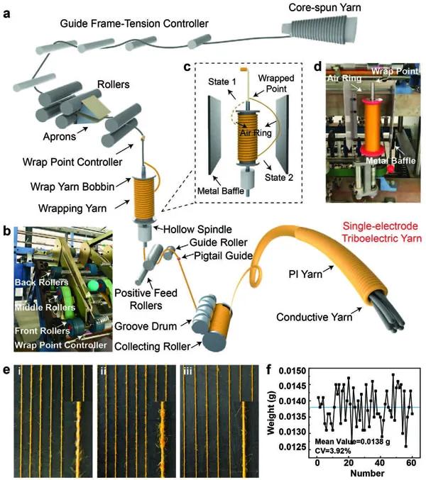 a)連續(xù)空心軸花式捻線機(jī)技術(shù)工藝示意圖。e)用黑板法表征FRTY紗線質(zhì)量的圖片。f)通過(guò)定量測(cè)試方法測(cè)定FRTY的重量,以表征紗線的細(xì)度和均勻性。