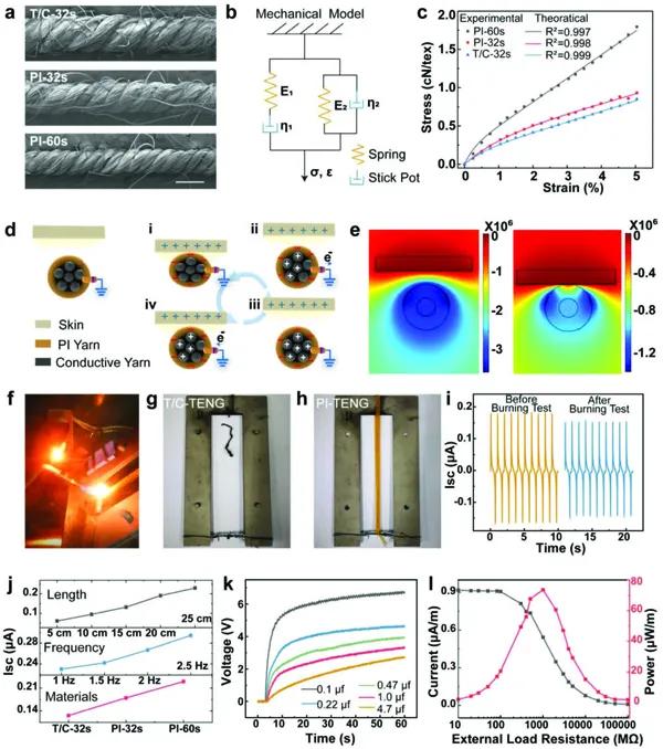 a)TENG紗線(比例尺:500 μm)的SEM圖像,分別為T/C-32s,PI-32s和PI-60s。b)TENG紗線非線性力學(xué)性能的本構(gòu)模型的圖示(注:σ表示TENG紗線上的應(yīng)力,ε表示TENG紗線的應(yīng)變,E1和E2表示虎克彈簧的彈性模量,η1和η2分別表示代表皮層紗和芯紗的黏壺的粘滯系數(shù)。c)TENG紗線的應(yīng)力-應(yīng)變曲線與模型預(yù)測(cè)結(jié)果的比較,為實(shí)驗(yàn)結(jié)果提供預(yù)測(cè)依據(jù)。e)COMSOL模擬的不同狀態(tài)下的電位分布。f)阻燃性能測(cè)試:g)T/C-32s TENG在燃燒測(cè)試后繼續(xù)燃燒成灰燼,h)PI-32s FRTY在燃燒測(cè)試后外觀保持穩(wěn)定,i)測(cè)試后電氣輸出性能僅略有下降。j)不同材料、頻率和長(zhǎng)度的TENG紗線的短路電流。k)PI-32s FRTY在1 Hz頻率和30 N力作用下的電容充電能力。l)在1 Hz頻率和30 N力作用下,在不同的外部負(fù)載電阻作用下測(cè)量PI-32s FRTY的電流和峰值功率。