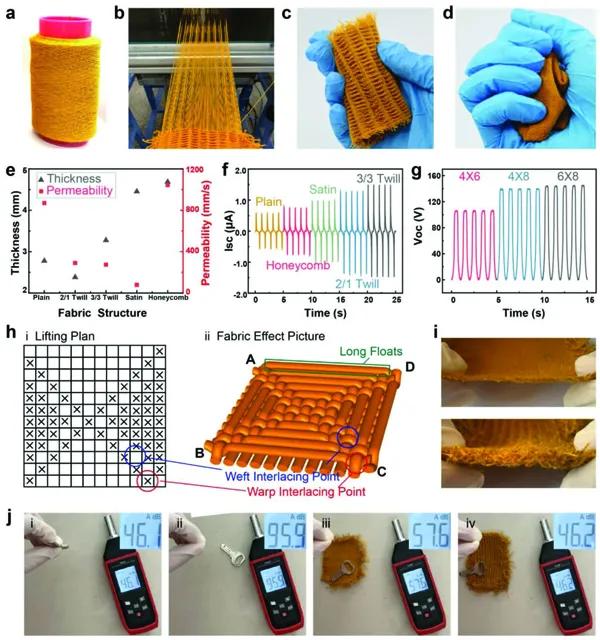 e)不同結(jié)構(gòu)的F-TENGs的透氣性和厚度。f)不同結(jié)構(gòu)的F-TENGs的短路電流。g)不同面積的3D F-TENG的開(kāi)路電壓。i)3D F-TENG和普通F-TENG厚度的比較。j)3D F-TENG和普通F-TENG降噪的比較。