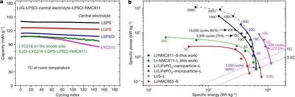 鋰金屬因其高容量和能量密度而被認為是鋰離子電池負極的最佳候選材料,而單晶LiNi0.8Mn0.1Co0.1O2(NMC811)被認為是下一代正極材料。采用NMC81正極與鋰金屬負極配對的電池的穩(wěn)定循環(huán)非常重要。然而,這種電池與大多數(shù)電解質(zhì),無論是液體還是固體,其穩(wěn)定性都很差。眾所周知,Li10±xM1±yP2±pS12±q(M=Ge,Si)與金屬鋰不穩(wěn)定。通常應用石墨或金屬銦等保護層來絕緣固體電解質(zhì)和金屬鋰之間的接觸。如果沒有這種保護,使用純金屬鋰作為電極和Li10Ge1P2S12(LGPS)作為電解質(zhì)的對稱電池會在有電壓火花的情況下迅速失效。盡管大多數(shù)硫化物固體電解質(zhì)在與金屬鋰接觸時會發(fā)生一定程度的分解,但硫銀鍺礦型Li6-yPS5-yCl1+y與金屬鋰比LGPS更穩(wěn)定。Li5.5PS4.5Cl1.5(LPSCl)可以運行150小時以上。然而,之后仍然會出現(xiàn)短路。今日,在哈佛大學李鑫教授(通訊作者)團隊帶領下,報告了一種界面穩(wěn)定性(對鋰金屬響應)分層結構的固態(tài)電池設計,實現(xiàn)無鋰枝晶穿透的超高電流密度。多層設計將較不穩(wěn)定的電解質(zhì)夾在較穩(wěn)定的固體電解質(zhì)之間,通過在較不穩(wěn)定的電解質(zhì)層中局部分解,阻止了任何鋰枝晶的生長。團隊提出了一種類似于膨脹螺絲效應的機制,即任何裂縫都被動態(tài)生成的分解物所填充,而這些分解也受到很好的約束,可能是由分解引起的“錨定”效應。鋰金屬負極與LiNi0.8Mn0.1Co0.1O2正極配對的循環(huán)性能非常穩(wěn)定,在20 C倍率下進行10000次循環(huán)后,容量保持率為82%(8.6 mA/cm2),在1.5C倍率下進行2000次循環(huán)后容量保持率為81.3%(0.64 mA/cm2)。同時,在微米級正極材料水平還能實現(xiàn)110.6 kW/kg的比功率和631.1 Wh/kg的比能量。相關成果以題為“A dynamic stability design strategy for lithium metal solid state batteries”發(fā)表在了Nature。