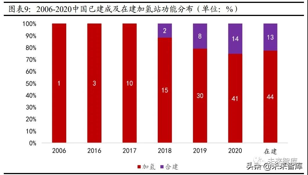 從加氫站的功能來(lái)看,國(guó)內(nèi)合建站占比逐年提高。根據(jù)《加氫站技術(shù)規(guī)范(國(guó)標(biāo) GB50516-2010)》,加氫站可以單站建設(shè), 但具有需要重新選址、投入成本高等弊端而 建設(shè)綜合加注站可以降低運(yùn)營(yíng)成本。國(guó)內(nèi)目前正積極探索“油、氫、氣、電”的聯(lián)合 建設(shè)運(yùn)營(yíng)模式,中石油、中石化等央企已開(kāi)始進(jìn)行相關(guān)的研發(fā)和建設(shè)。