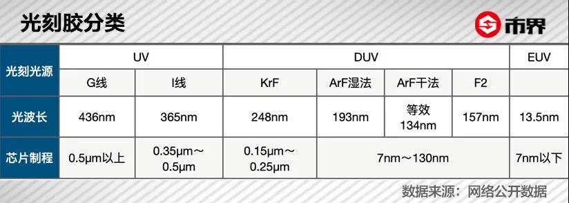 一定程度上來說,光刻出的電路圖案越精密,就代表著芯片性能越好。采用不同的光刻光線,對應地需要搭配不同的光刻膠。目前,根據不同的光波長,光刻膠大致可以分為G線、I線、KrF、ArF、EUV這幾類。
