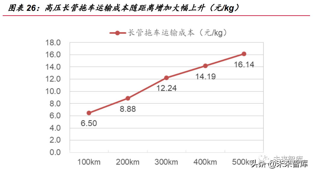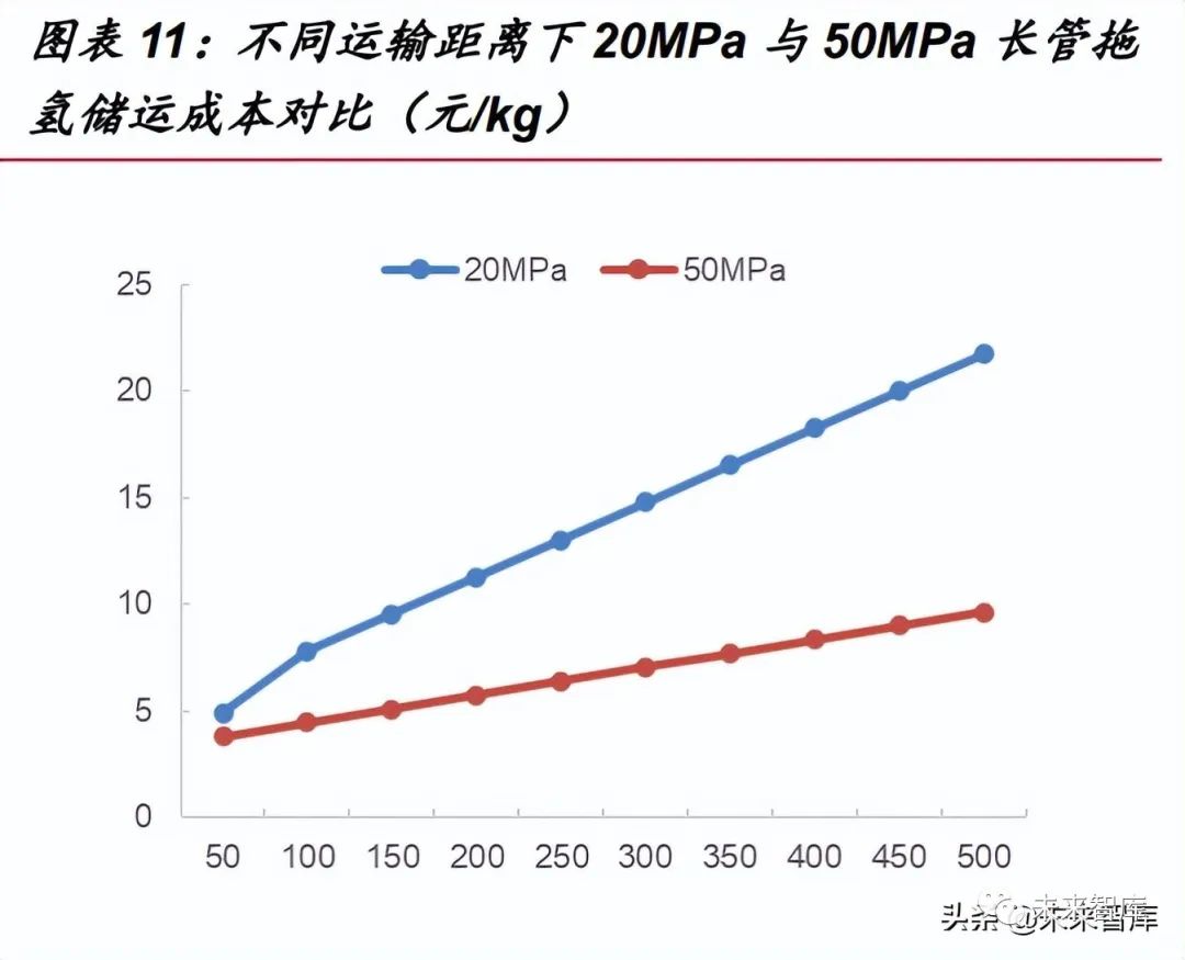 高壓長管拖車運(yùn)輸成本隨距離增加大幅上升。根據(jù)以上假設(shè),可測(cè)算出規(guī)模為 500kg/d、距離氫源點(diǎn) 100km 的加氫站,運(yùn)氫成本為 6.50 元/kg。隨著運(yùn)輸距離的增 加,長管拖車運(yùn)輸成本逐漸上升。距離 500km 時(shí)運(yùn)輸成本達(dá)到 16.14 元/kg(注:當(dāng) 輸送距離超過 200km 后,單輛拖車已無法實(shí)現(xiàn)當(dāng)日往返多次來滿足用氫需求,超過 200km 后,我們以多輛拖車同時(shí)運(yùn)輸來計(jì)算)。因此,考慮到經(jīng)濟(jì)性問題,長管拖