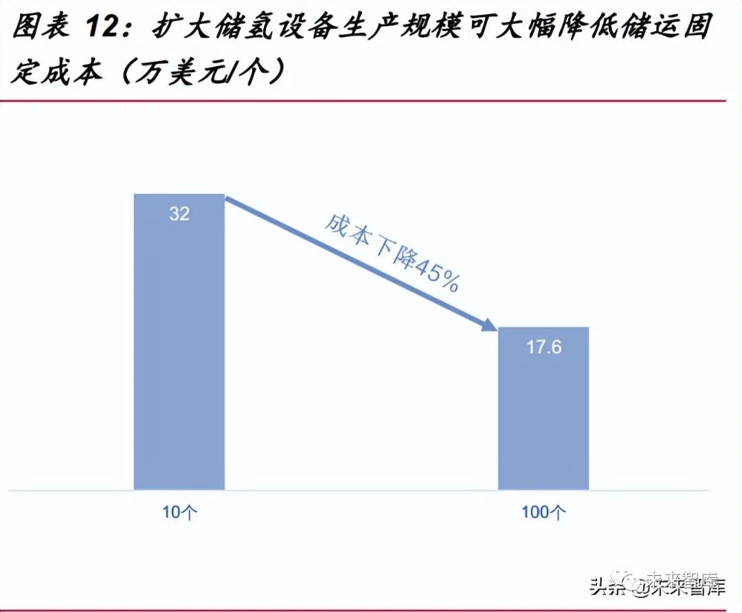 未來長管拖氫儲(chǔ)運(yùn)成本下降的有效路徑是:一方面可通過提高儲(chǔ)氫壓力,實(shí)現(xiàn)儲(chǔ) 氫密度和運(yùn)輸效率都更高的氫氣儲(chǔ)運(yùn)方式;另一方面,未來氫氣氣態(tài)儲(chǔ)運(yùn)成本下降的 有效路徑是擴(kuò)大相關(guān)設(shè)備生產(chǎn)量。單位成本將在規(guī)模效應(yīng)下逐步下降。據(jù) NREL (National Renewable Energy Laboratory)預(yù)測(cè),當(dāng)儲(chǔ)氫容器需求量從 10 增加到 100 個(gè)時(shí),儲(chǔ)氫容器成本可下降約 45%。
