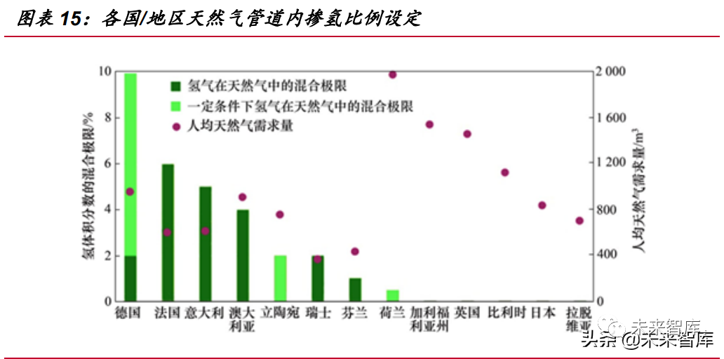 氫能產(chǎn)業(yè)發(fā)展初期階段,管道氫可由天然氣管道摻氫來實(shí)現(xiàn)過渡。由于純氫管 道的初始投資較大,不適合作為氫能發(fā)展初期應(yīng)用,在管道運(yùn)輸發(fā)展初期,可以積極 探索摻氫天然氣方式,即利用已建設(shè)的天然氣輸配管網(wǎng)與基礎(chǔ)設(shè)施進(jìn)行天然氣和氫氣 混合輸送,也可經(jīng)改造后輸送純氫,可實(shí)現(xiàn)低成本、規(guī)?;⑦B續(xù)性氫能供應(yīng)。研究 結(jié)果表明,在含量較低時(shí)(10-20%摻氫比例),氫氣可以在不做重大技術(shù)調(diào)整的情況 下?lián)交熘撂烊粴狻N磥泶罅Πl(fā)展天然氣摻氫管道輸送技術(shù),關(guān)鍵需要解決管材、調(diào)壓 站、流量計(jì)、探測(cè)器等配套裝備的摻氫相容性與適應(yīng)性并完善管網(wǎng)安全運(yùn)行保障技術(shù)。 天然氣摻氫管道輸送技術(shù)是目前進(jìn)行大規(guī)模、長距離氫氣輸送最為有效手段之一。