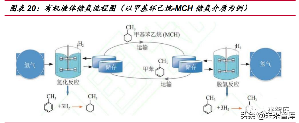 有機(jī)液體儲(chǔ)氫優(yōu)勢(shì)在于:加氫后的有機(jī)氫化物性能穩(wěn)定,安全性高,可常溫常壓 儲(chǔ)存,儲(chǔ)存方式與石油相似,質(zhì)量儲(chǔ)氫密度高,可達(dá) 5.0-7.2%/wt。其劣勢(shì)在于:氫 氣純度不高,有幾率發(fā)生副反應(yīng),產(chǎn)生雜質(zhì)氣體;反應(yīng)溫度較高、脫氫效率較低、催 化 劑易被中間產(chǎn)物毒化;液氫儲(chǔ)存壓縮能耗過大,需配備相應(yīng)的加氫、脫氫設(shè)備。 未來的技術(shù)突破方向是:提高低溫下有機(jī)液體儲(chǔ)氫介質(zhì)的脫氫速率與效率、催化 劑 反應(yīng)性能,改善反應(yīng)條件、降低脫氫成本及操作難度。