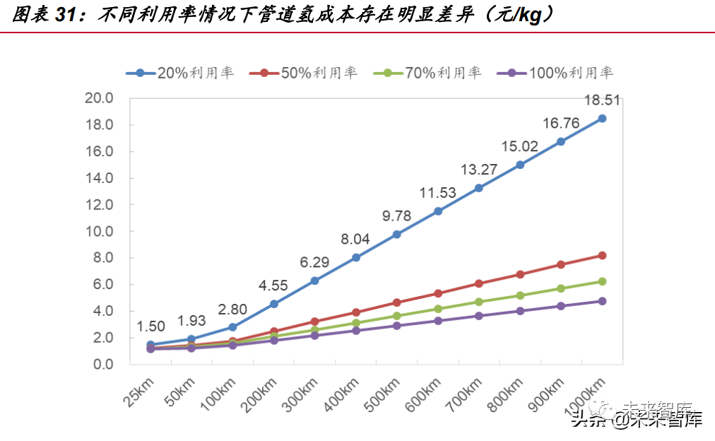管道氫成本很大程度上受到需求端(利用率)的影響。在上述管道氫成本預(yù)測(cè) 中,我們假設(shè)管道運(yùn)能的利用率達(dá)到 100%,在這種水平下,管道氫運(yùn)輸成本表現(xiàn)出 非常低的水平,但隨著利用率水平的下降,管道氫成本陡然上升,當(dāng)運(yùn)能利用率僅為 20%時(shí),管道運(yùn)氫的成本已經(jīng)接近長管拖車運(yùn)氫。在當(dāng)前加氫站尚未普及、站點(diǎn)較為 分散的情況下,管道運(yùn)氫的成本優(yōu)勢(shì)并不明顯。隨著氫能產(chǎn)業(yè)逐步發(fā)展,氫氣管網(wǎng)終 將成為低成本運(yùn)氫方式的最佳選擇。