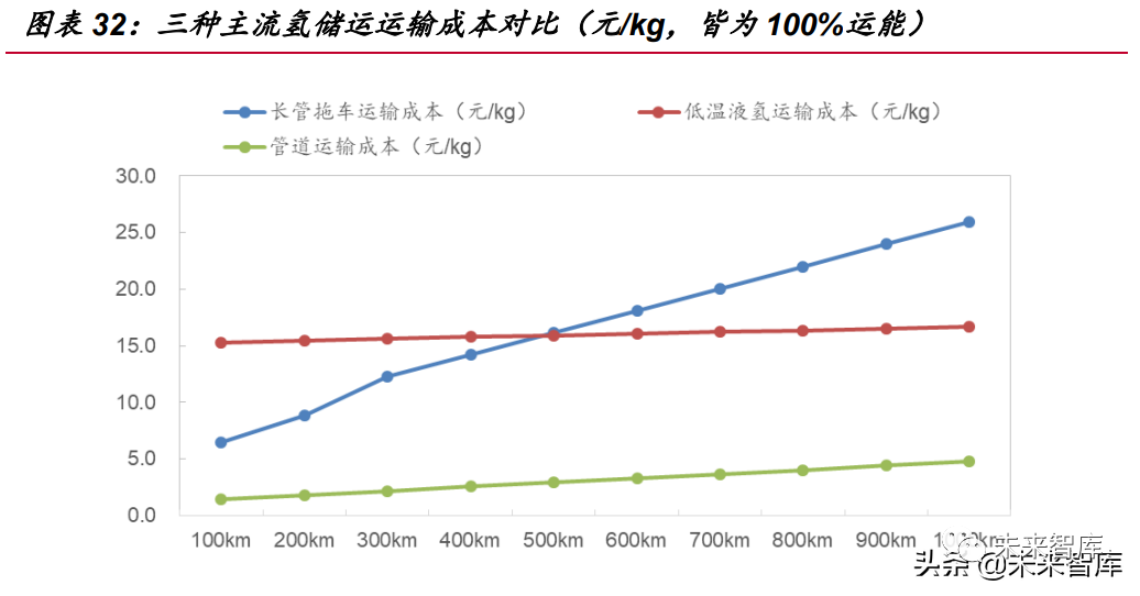 大規(guī)模輸送下,管道輸氫具備明顯成本優(yōu)勢(shì)。根據(jù)以上假設(shè),可測(cè)算出長度 25m、 年輸送能力 10.04 萬噸的氫氣管道,運(yùn)氫成本為 1.16 元/kg。由于壓縮每公斤氫氣所 消耗的電量是相對(duì)固定的,管道運(yùn)氫成本增長的驅(qū)動(dòng)因素主要是與輸送距離正相關(guān)的 管材折舊及維護(hù)費(fèi)用。當(dāng)輸送距離為 100km 時(shí),運(yùn)氫成本為 1.43 元/kg,同等運(yùn)輸 距離下管道輸氫成本遠(yuǎn)低于高壓長管拖車及低溫液態(tài)輸氫。因此,當(dāng)氫氣下游需求足 夠支撐大規(guī)模的氫能輸送,通過管道運(yùn)輸氫氣是一種降低成本的可靠方法。